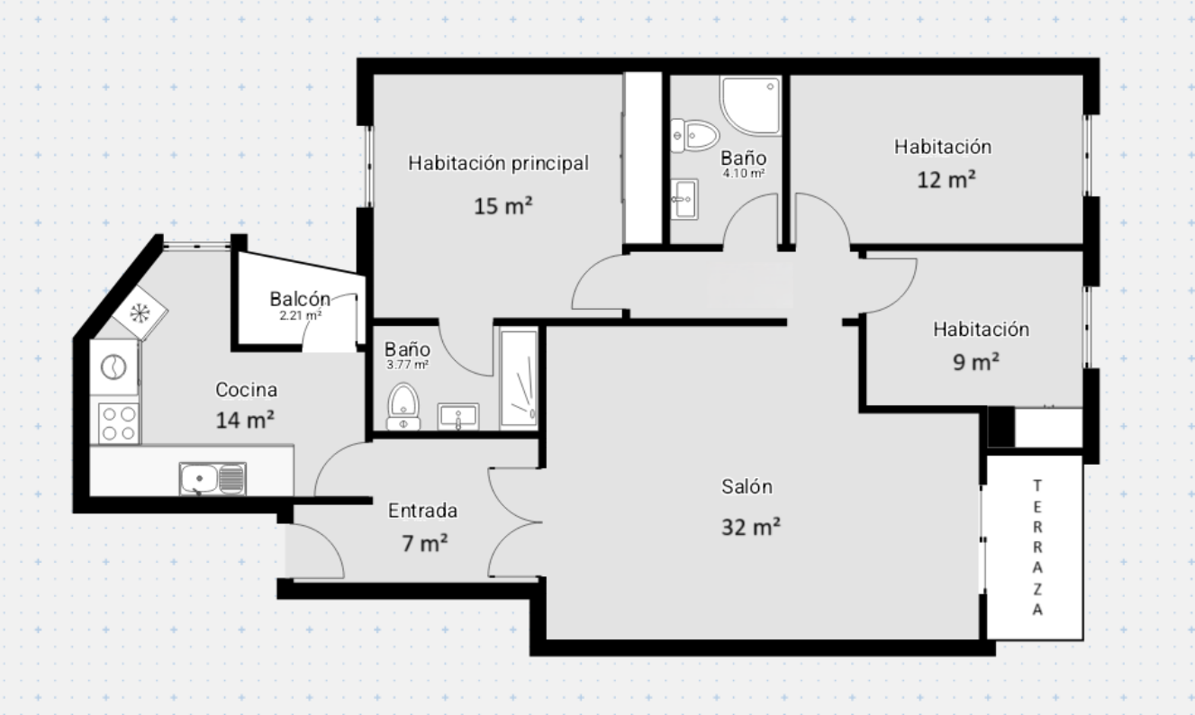 – DISTRIBUCIÓN: Amplio hall recibidor de 7 m². Cocina office de 14 m², totalmente amueblada, con electrodomésticos y salida a pequeña terraza interior tendedero. Salón comedor de paso de 32m² con A/A por split con bomba frío/calor y salida a terraza exterior cubierta con toldo y buenas vistas. 3 dormitorios dobles de 15 m², 12 m² y 9 m², 2 de ellos con armarios empotrados. 2 Cuartos de baño completos con plato de ducha y mampara, uno de ellos en suite en la habitación principal.