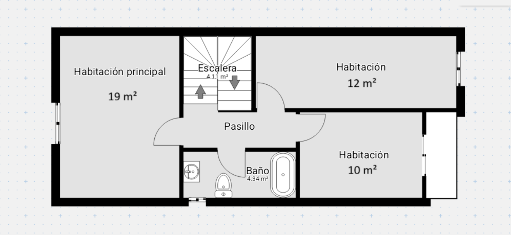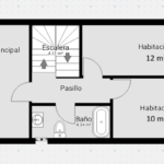 - Planta Primera: Hall distribuidor. 3 dormitorios dobles de 19m², 12 m² y 10 m², uno de ellos con salida a terraza descubierta. Cuarto de baño completo con bañera y ventana.