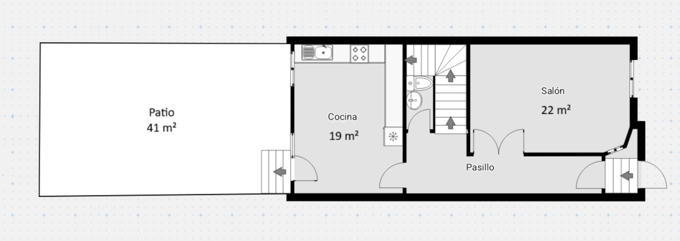 - Planta Baja: Hall recibidor. Cocina de 19 m² totalmente amueblada y con salida a patio de 40 m². Salón comedor independiente de 22 m². Aseo de cortesía.