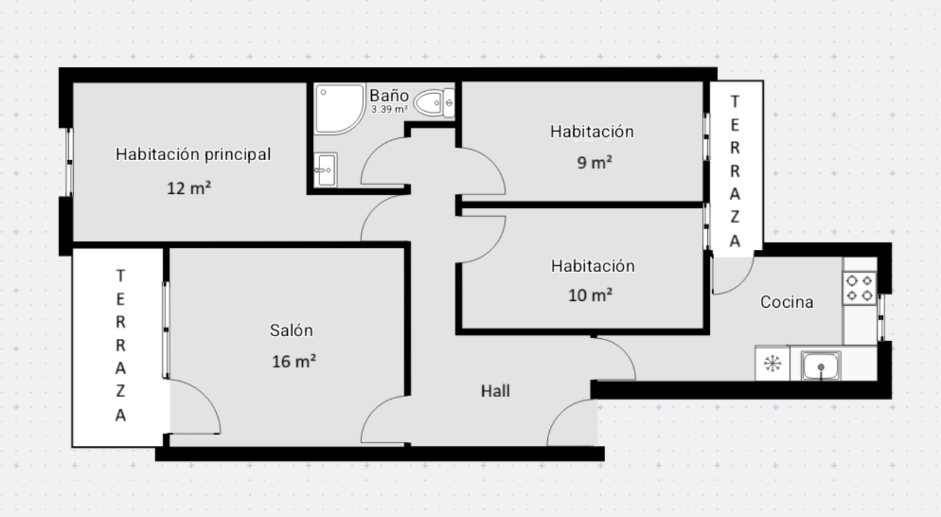 DISTRIBUCIÓN: Amplio hall recibidor de 5 m². Cocina con salida a terraza tendedero cubierta. Salón comedor independiente de 16 m² con A/A por split y con salida a terraza descubierta de 5 m². 3 dormitorios dobles de 12 m², 10 m² y 9 m², el principal con A/A por split. 1 Cuarto de baño completo con plato de ducha y mampara.